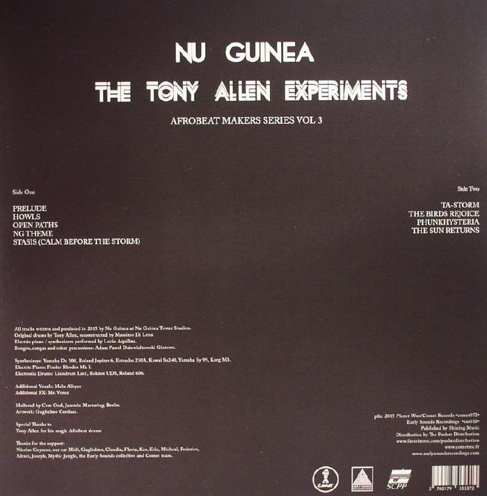 Italian duo Nu Guinea has previously proved adept at creating humid, sultry deep house and tropical-infused electronics. Here, they focus a little more on the latter with a concept album based around the distinctive Afrobeat rhythms of legendary drummer Tony Allen. With his blessing, and that of the Comet label on which he's been releasing since the 1980s, the Early Sounds Recordings pair has cut-up and re-constructed Allen's drums, combining them with their own steamy electronics, vintage synthesizer lines and classic drum machines. It's an intoxicating and hugely entertaining blend that sits somewhere between their previous outings, Danny Wolfers' material under the Nacho Patrol guise, and the dreamy late '80s/early '90s work of forgotten Italian producer Mr Marvin.