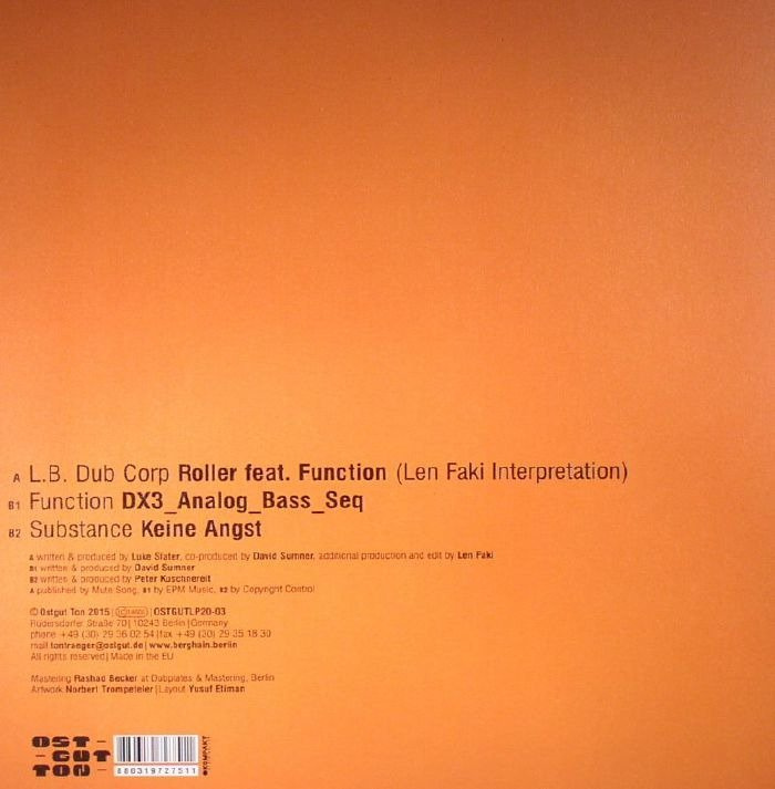 Last year Berlin institution Ostgut Ton marked their ten-year anniversary with an extensive 30 track compilation housed across the width of ten 12"s and packed neatly in a rather fancy looking box set. Long since sold out, Ostgut have done the right thing by commencing a series of individual 12" reissues featuring all of the music for the label fans who missed out first time around. After Eins and Zwei, we arrive at Zehn / Drei which features a triplet of modern techno productions from four of the label's closest associates. Up top Len Faki remixes the LB Dub Corp and Function collaboration "Roller", adding a subtle few notches of intensity to the original, whilst Dave Sumner goes alone on the lead B-side track "DX3_Analog_Bass_Seq". Lastly Substance aka DJ Pete offers up "Keine Angst," a fleet-footed tribal stomper and jacking vocal samples.