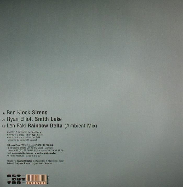 Part nine of ten in Ostgut Ton's tenth various artists compilation and they're pulling out the big guns now to celebrate proceedings with a big bang. Star resident Ben Klock has taken quite a long hiatus from production but he's still got it, as shown on the tunnelling and cyclical cut "Sirens". Fellow resident and Detroit ex-pat Ryan Elliott serves up the soulful and emotive "Smith Lake" which is brilliant and reminds us of Exos or "Dead Eye" era Baby Ford. Finally resident party animal Len Faki surprises many with the ambient mix of his undisputed anthem "Rainbow Delta" and it is absolutely sublime; you can just drift away to this one, you'll see!