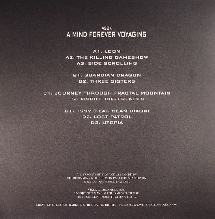 Liverpool artist Stu Robinson aka ASOK steps up to Creme Organization with a debut full length offering, A Mind Forever Voyaging, due out spring 2016. Featuring ten tracks of macho yet melodic, tender yet tense analogue house and techno, it is a continuation of the fine work the Scenery Records boss has done for labels like M>O>S and Mistress in the last few years. Something of a late starter, Robinson has fomented his own mystical, nostalgic, inventive analogue sound that makes you jack, as well as conjuring real emotions with his great knack for melody. This album was recorded live then edited down. "So if something doesn't sound good it either stays in or I re-record the whole thing," says Robinson, who used things like Maschine, tb303, analog RYTM, JX-8P, Microkorg, some plugins and "a shit load of old rave samples" to create his debut full length. All written at home over a period of a year or so, it proves the artist has plenty of ideas and more than enough skills to carry them off. All unified by a sense of emotion and kinked dance floor groove that has been picked up over the course of 25 years of living and breathing many different forms of dance music, it is an accomplished debut.