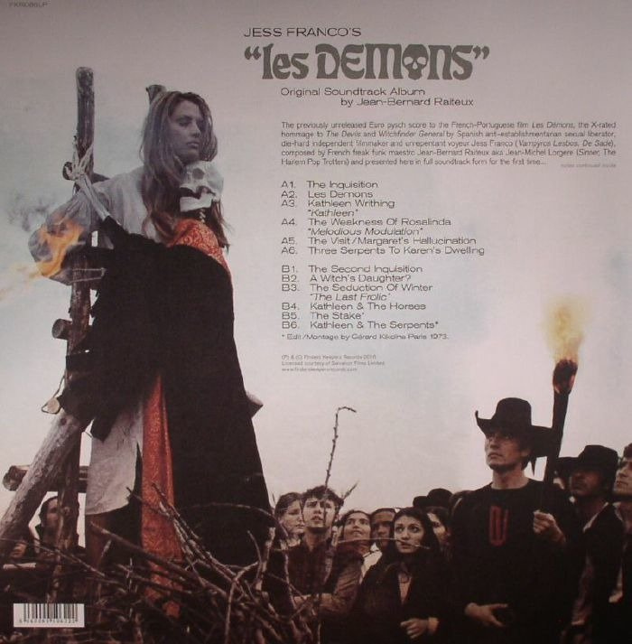 The unreleased Euro psych score to the French/Portuguese X-rated version of The Devils meets The Witchfinder General! Proudly claiming the dubious accolade of the Spanish sexploitation version of The Devils as the distributor’s most bankable asset, this previously banned 1973 European witch flick would rip the art house facade from Ken Russell’s well polished box office smash and push the envelope way beyond the closet titillation of the gentrified new wave controversy seekers. Delivered on a comparable shoestring budget as the 55th feature in Jess Franco’s filmography of approximately 203 completed movies, The Demons (Les Démons), directed under the Anglicised pseudonym Clifford Brown, took many of the Franco’s sexually stylistic watermarks (epitomised in his Vampyros Lesbos trilogy) adding witchcraft, possession and nunsploitation against a rural Mediterranean backdrop before disappearing into the woods. Whilst clearly taking inspirational plot cues from Michael Reeve’s The Witchfinder General (UK 1968) and drawing comparisons with scenes from Eiichi Yamamoto’s Belladonna Of Sadness (Japan 1973) this B-Movie reduction of Franco’s wide palette of colourful ingredients has in recent years provided enthusiasts/champions/defenders of the workaholic horrotica bastion with a rare and treasured addition. Future-proofed by an essential component, omnipresent in Franco’s films, it is the mysterious commercially unobtainable soundtrack music that cements the unwaning interest in his risqué brand of unconventional shock/schlock sinema (not hindered my the enigmatic title card misinformation that often surrounds the original composers) and the music herein that has given Franco’s harshest critics a second chance/reason to reevaluate this man’s unapologetic art.