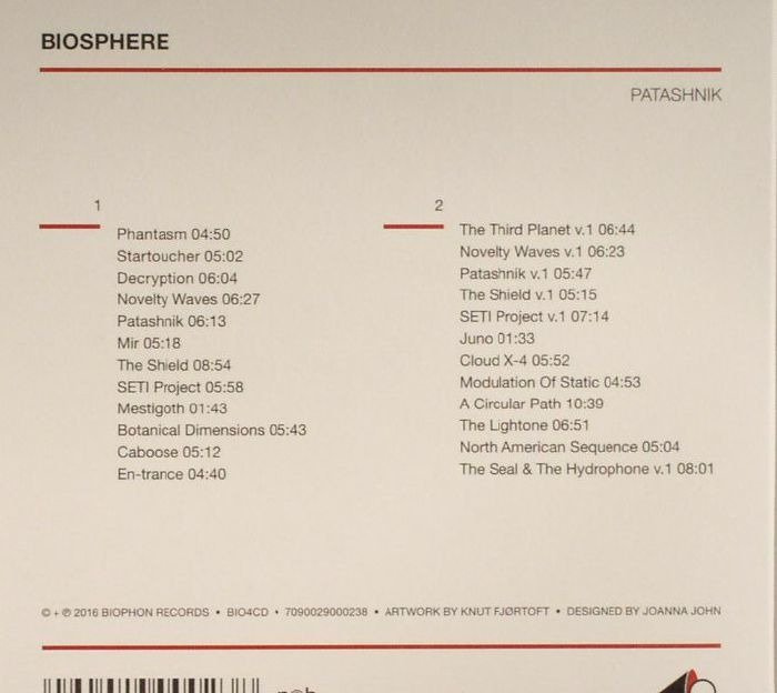 Biosphere is the main recording name of Geir Jenssen (born 30 May 1962),[1] a Norwegian musician who has released a notable catalogue of ambient electronic music. He is well known for his works on ambient techno and arctic themed pieces, his use of music loops, and peculiar samples from sci-fi sources. His 1997 album Substrata was voted by the users of the Hyperreal website in 2001 as the best all-time classic ambient album. Patashnik was originally released by R&S Records/Apollo in 1994. It was number 1 in NME´s Independent Chart in March 1994 and reached number 50 in the UK official album chart. The track Novelty Waves was used in Michel Gondry's Levi's 501 Jeans "Drugstore" spot, and holds - according to the Guinness World Records 2004, the record for "Most awards won by a TV commercial". This reissue contains the bonus 12-track album Patashnik 2. AllMusic Review by Ned Raggett: One reason why Jenssen's work stands out from the flood of early '90s ambient/techno releases is his strong sense of the quirkily creepy -- not in an Aphex Twin mode, but in his own particular way. The contrasting samples of a child quaveringly saying, "We had a dream last night," followed by a rougher sample saying, "We had the same dream," gives opening number "Phantasm" an unsettling feeling. Intensified by the, on the one hand, pretty, on the other, disturbing music, buried synth strings and a soft pulse accentuated by clattering noises deep in the mix, it kicks off the striking Patashnik very well. Though not as openly dark as acts like Lull, for instance, Biosphere still has an edge which isn't just melancholic, it's downright ominous at point. There's the slow crawl of "Startoucher," for instance, with its buried vocal snippets and deep bass drone, or the blend of the space signal atmospheres of "Mir" into the low, brooding intro to "The Shield." Not everything is so shadowy, though; Patashnik is primarily a relax and chill listening experience, but not without its gentle high points. "Novelty Waves," which became a crossover single in some quarters, has a good dancefloor sharpness to it even as Jenssen slyly sneaks in odd drones and samples through the mix. The opening snippet talking about an extraterrestrial disc jockey on "SETI Project" is good for a smile, as well as acting as a sharp lead-in to a fast rhythm track. Mostly, though, things continue on a deliciously unnerving pace throughout, gentle enough to go down easy but still just off enough to ensure you can't call this new age folderol for the rave generation.