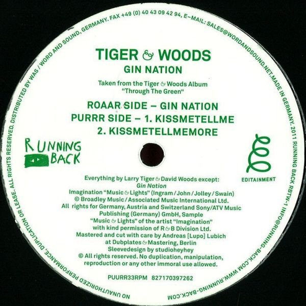Last repress of Tiger & Woods gin nation. please preorder now! 12″ Album Sampler for Tiger & Woods’ debut long player “Through The Green". Featuring the dynamic duo’s top secret super hit “Gin Nation” and the brand-new ecstasy epic “Kissmetellme” - including the DJ-friendly beat-up heat-up “Kissmetellmemore". You’re in for some top notch Editainment. Shrouded in mystery! Here today, won’t be gone tomorrow…