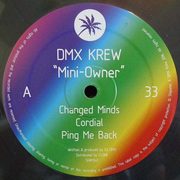 Firm favourite DMX Krew returns to Shipwrec for his third release. A spiral of styles come together for Mini-Owner. Funk. Electro. Synth. All are twirled, whirled in a shimmering sound. Cold chords meet warm fronts, meandering grooves and playful interlock to produce a sound that is totally unique. Energy levels are high throughout, sun soaked synthlines dappled by glowing rhythm patterns as Ed DMX delivers six tracks of grin-inducing electronics. First run pressed on 200 coloured copies.