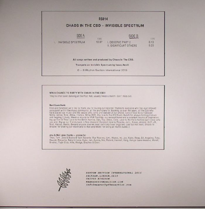 South London favourites Chaos in the CBD come back to Rhythm Section International one year after their breakthrough EP ‘Midnight in Peckham’. The original EP captured a moment in time in a way few songs can manage. It was hailed as a masterpiece, capturing the attention of all who listened, as evidenced by the unquenchable demand for the 12”. This follow up EP is an equally sublime collection of tracks that revel in the late night soulful feel that Chaos in The CBD have been honing over the past two years. The music’s strength lies in it’s subtlety - the tracks demand your attention in an effortless fashion and hold it, right ‘till the last beat. Another unbelievably powerful record from RS INTL, who are proving to be unstoppable of late. BUY ON SIGHT!