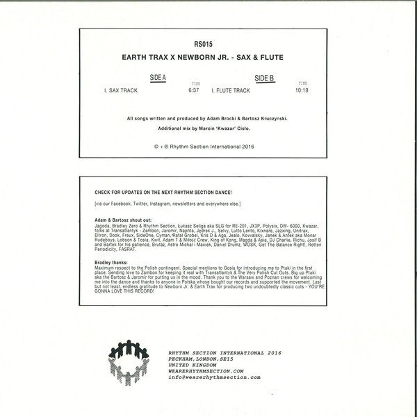 For Rhythm Section International's fifteenth 12" release, Bradley Zero has looked to the bourgeoning Polish house scene. It sees occasional Transatlantyk artist Newborn Jr. (AKA Adam Brocki) join forces with the previously unheralded Earth Trax. They open with the tactile, wide-eyed warmth of "Sax & Flute", where dreamy, stretched-out chords, toasty bass and hazy house breakbeats rub shoulders with punchy, synthesized saxophone and flute lines. It's reminiscent of not only 808 State's "Pacific", but also Italian "ambient house" (Morenas, Lux, Midas etc.) of the same period. Flipside "Flute Track" is similarly woozy and loved-up, though its' twittering synth-flutes, chiming melodies and bold bassline recall memories of Orbital's more Balearic-minded moments, rather than Sueno Latino.