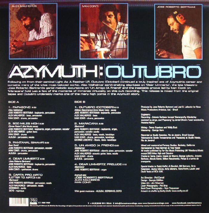Following on from their seminal Light As A Feather LP, Outubro (October) was originally released in 1980 and began Azymuth’s run of prolific output for Milestone Records throughout the decade Following on from their seminal Light As A Feather LP, Outubro (October) was originally released in 1980 and began Azymuth’s run of prolific output for Milestone Records throughout the decade. Typifying the consummate craftsmanship of the three members’ performances - each with such distinct personality and together so perfectly balanced - their perfectionist attitude to sound is maintained across the production on the album, beautifully colouring the expressionist fusion of samba rhythm, jazz progression, funk attitude and psychedelic electronics.