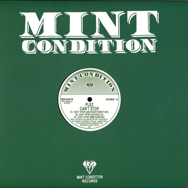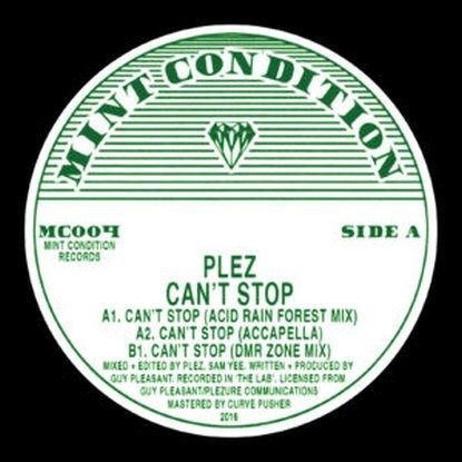 Guy ‘Plez’ Pleasant dropped this monstrous slab of proto-tribal Techno on his own Plezure label way back in ‘88. The rest, as they say, is history. A stone cold NYC club bomb was dropped. Literally. The fact that this record is still played, still talked about, still sought after really says something about it’s heady mix of heads down dark corner tribalism, it’s screeching, soaring synth lines and it’s sheer balls out attitude. This one goes off. A cursory glance shows that Plez only did a handful of records, with “Can’t stop” definitely being the biggest and most well known and loved (honorary tip of the cap to ‘Thing for you’ here too). The ‘Acid rainforest’ mix featured on this 12″ is a dangerous weapon in any DJ’s bag, submerging the dance-floor into an otherworldly jungle planet. Heavy, heavy stuff. Here’s the chance to bag yourself a classic slice of NYC dance history, sounding as heavyweight as ever, ready to do damage. Fully remastered specially for Mint Condition, ‘I can’t stop’ is back, as notorious as ever. Legitimately re-released with the full involvement of Guy ‘Plez’ Pleasant for 2017 and remastered from the original DAT’s specially for Mint Condition by London’s very own Curvepusher. 100% legit, licensed and released. Dug, remastered, repackaged and brought to you by the caring folks at your new favourite reissue label - Mint Condition!.