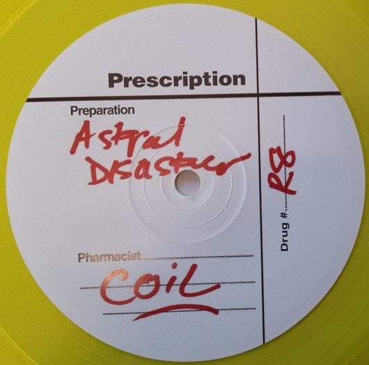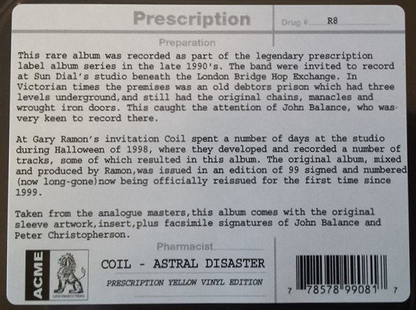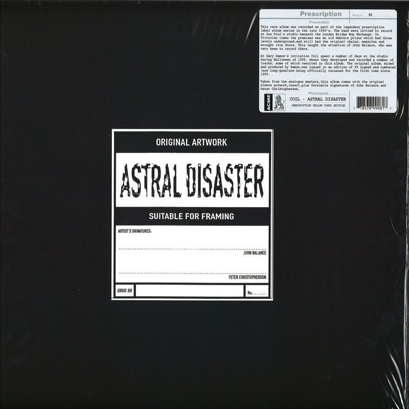 This rare album was recorded as part of the legendary prescription label album series in the late 1990's. Coil were invited to record at sun dial's studios beneath the London Bridge Hop Exchange. This studio was originally know as Samurai studios that was originally built and owned by Iron Maiden. The premises in Victorian times was an old debtors prison which had three levels underground, and still had the original chains, manacles and wrought iron doors from the old prison. This caught the attention of John Balance and was very keen to record there. At Gary Ramon's invitation, Coil spent a number of days recording at the studio during Halloween 1998 and they developed a number of tracks some of which resulted in this LP. The other material has remained unreleased - however we hope to bring them out one day. Ramon produced and mixed the "Astral Disaster" recordings, as well as playing guitar and sitar on these sessions. The original album was issued on Prescription in an edition of 99 signed and numbered copies, which are long time sold out. Originals fetch £700+. This is the first time the album is being reissued officially since 1999. A version of this album was later remixed by the band and released on their own label, however these Prescription mixes are unique to this first release of "Astral Disaster". Taken from the original masters this album comes with original sleeve artwork, insert and facsimile signatures of John Balance and Peter Christopherson that came with the first issue.
