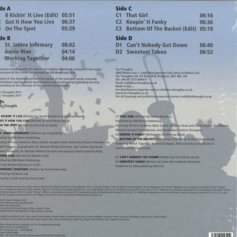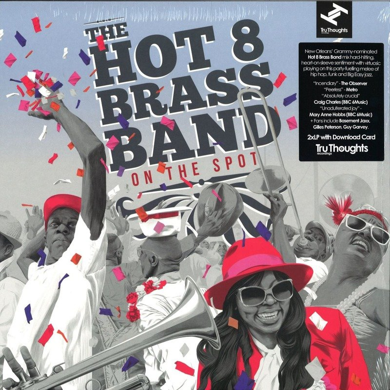 New Orleans' Grammy-nominated Hot 8 Brass Band release their ffh LP, 'On The Spot'. In true Hot 8 style, this album pairs hard-hitng, heart-on-sleeve sentment with party-fuelling beats, hooks and grooves, raw funk and charismatc hip hop vocals mix with Big Easy jazz elegance. Expect unshakable horn rifs and bubbling bass as the record transports you right into the centre of an electrifying Hot 8 party crowd. The ttle of the new album refers to the glorious, rare moment in a New Orleans parade when the band stops to take a break but keeps noodling with their instruments for the crowd. Vibing, keeping the energy up, when they're completely in the moment they sync up and the magic happens - a new tune is created: On The Spot. Their ffh LP sees Hot 8 commitng this live sound and spirit to record like never before - note the exclamaton captured on tape at end of the ttle track: Did we just make that up!' These 11 tracks have helped the band get through their up and down moments, 'On The Spot' honours fallen friends and the city of New Orleans, and showcases new heights achieved afer coming back from the deepest lows. We stll break down a lot,' says bandleader and tuba player Bennie Pete, but now it's tears of joy. We keep everything in our hearts, but we keep on.'