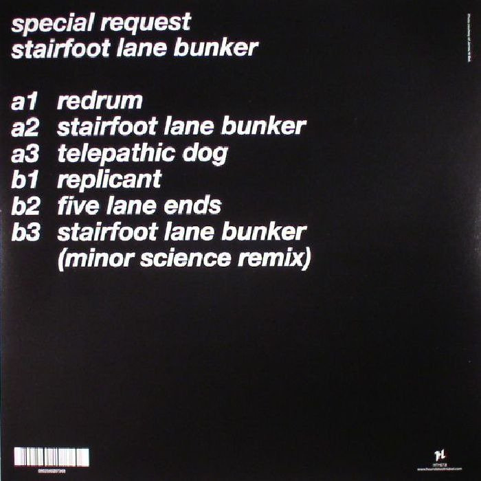 Discographies in dance music don’t come much more impressive than that belonging to Paul Woolford, the man behind seminal releases for the likes of Planet E, XL Recordings and Running Back. Special Request is the project that sees him continuing to defy expectation with a new EP on the fabric-run label Houndstooth. ’Stairfoot Lane Bunker’ encapsulates this approach with 5 bold new excursions into the outer limits followed by a remix from Minor Science (known for his previous releases on Whities and The Trilogy Tapes) The eagle-eyed will notice 5 of these tracks appear on FABRICLIVE 91. This EP is issued as an addendum. ‘Redrum’ is the fierce opener. Rampantly-edited electro beats, a sampled speak-n-spell vocal, and a pure sci-fi breakdown sets the scene for the rest. ‘Stairfoot Lane Bunker’ and ‘Replicant’ are jungle tracks taken to dizzying extremes - the former building from widescreen atmospherics, thunder spells and lightning before descending into a frenzy of breakbeats and long heavy bass notes. ‘Replicant’ ratchets the pressure up further with hyper-edits across it’s breakbeat introduction and throughout, punctuated by furnace-rattling subs. ‘Telepathic Dog’ and ‘Five Lane Ends’ are highly evocative ambient pieces, pushing into the uncanny realms of metaphysical music. To end the release Minor Science comes through with his remix of ‘Stairfoot Lane Bunker’, effortlessly blending in his own work with the disjointed SR breakbeats, flashing only snippets of the serrated bars, chopping them up and creating a new track in the process.