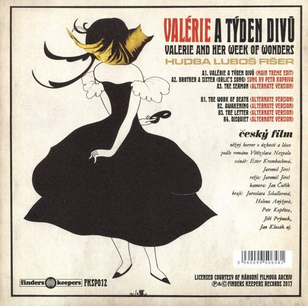 Finders Keepers Records now celebrate 10 years since the first-ever releases of the Czechoslovakian soundtrack to the surrealist new wave masterpieces Valerie And Her Week Of Wonders (Valerie a tyden divu) with a very special additional 7" EP of further unreleased variations, vocal tracks and newly resurrected themes from the original master tapes of composer Lubos Fiser. . Possibly the most treasured modern surrealist artefacts from the vibrant and indelible Czech New Wave "film miracle"(alongside Vera Chytilovᒒs Daisies and Fruits Of Paradise) Valerie And Her Week Of Wonders was directed by the controversial Jaromil Jires (a member of the original 60's FAMU film school community) and featured young freak fairytale regular Jaroslava Schallerova (Mala morska vila) and Helena Anyzova (Daisies/The Cremator) but aside from it's stunning cast and breathtaking design and costumes (by Esther Krumbachova) it was in fact the delicate European cinematic small orchestra music score that went to future-proof this film for decades after it was first released in the eye of a 1970 communist censorship cull (thus earning ing Valerie the much touted/debated final film of the CNW anti-accolade). Rewound, repackaged, mislead, misinterpreted, overanalysed and undersold, Valerie And Her Week Of Wonders would be scantily syndicated and and repackaged in various decontextualised arenas throughout the 80s and 90s via b-movie and eurosleaze channels to be eventually adopted by the VHS generation with the reignition of films by Jess Franco and Jean Rollin before finally regaining its rightful status as a genuine European new wave masterstroke emerging from the rubble of the final fall of communism in the early 90s. As a direct inspiration for bands like Broadcast and Espers, this 7 track single also macabre sound design, effects and dark atmospherics which are not available on the Finders Keepers LP version and is housed in unique packaging based on a rare variation of the original Czech film poster.