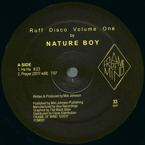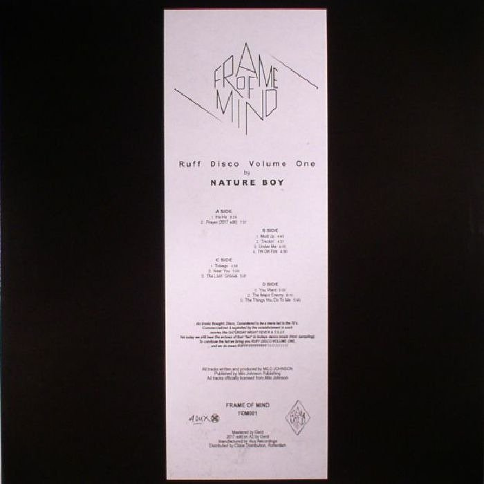 Frame Of Mind is a new venture initiated by Gerd: a label that focuses on re-issuing rare and sought-after tracks as well as on releasing new music. First up we serve you this official re-release of Nature Boy’s classic Ruff Disco Volume One. This highly in demand double pack goes for mad money on the second hand market, so after 25 years, a beautifully remastered edition is finally here. Nature Boy’s sound is best described as a rough combination of disco infected grooves with raw and hard hitting rhythms. Tracks such as The Livin’Groove, Ha Ha, Trackin’ and of course Tobago caused bliss and mayhem on dance floors world wide and brought joy to thousands and thousands of dancers, dj’s and music collectors all over the globe. This LP displays a fine mixture between house, disco and sometimes even dub/reggae. To this day Ruff Disco Volume One is a timeless work of art.
