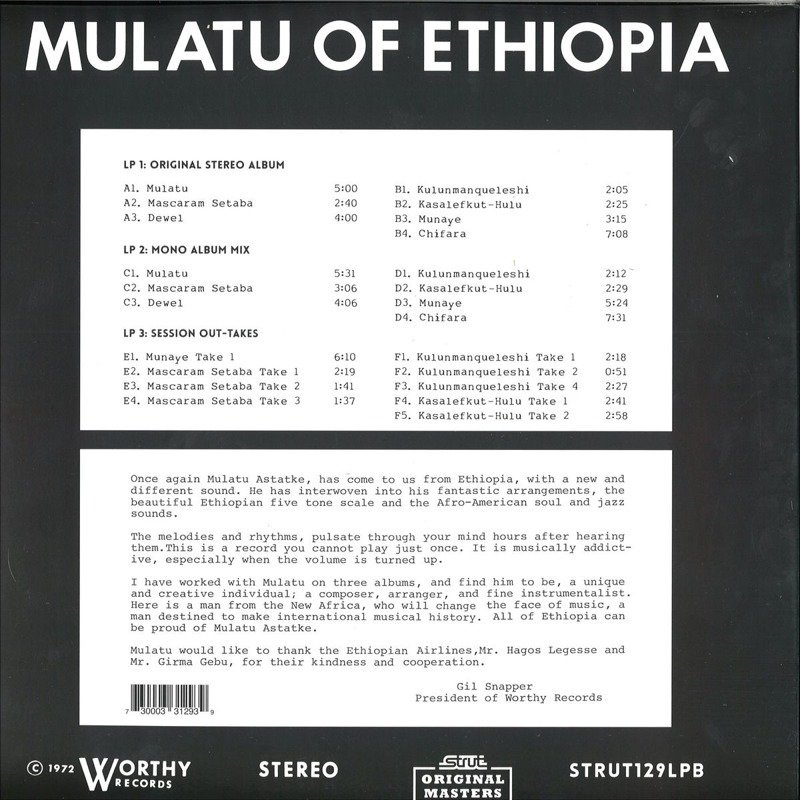 While many avid Mulatu fans will no doubt already own a copy of the master's first - and perhaps most ingenious - work from 1972, one can certainly rely on the mighty Strut to put together a fine reissue. Of note, unlike the many versions which have been retrained by Worthy Records over the years, this new take includes many little extras that are special enough to tempt even the most munitioned Mulatu collectors; aside from seven tracks from Mulatu Of Ethiopia, an utterly inimitable psychedelic jazz journey that defined Ethiopia's entire sound in relation to the genre, this new version includes a whole selection of previously unheard cuts. There are mono album mixes of all the original tunes plus a wide selection of 'takes' from the original recording session, so this LP should have no problem in working up a bit of hype and hysteria from the original-pressing-junkies. This is an essential, highly recommended!