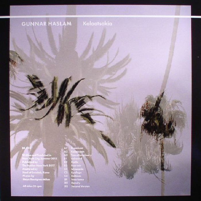 The latest transmission from the world of Gunnar Haslam, Kalaatsakia wildly sprawls across the intersections of techno and more abstract sounds to take us on a wideranging journey from the subterranean to the coastal, from blown-out dub tones through fractured rhythms. An incredible work that is not easy to pigeonhole, Kalaatsakia is a full length album that navigates and sketches landscapes where new languages are created from old, dead ones to emerge as the lingua franca of interconnected immersive zones. . Haslam is an avid home listener of dub, dancehall and calypso, and that influence is quickly felt as Kalaatsakia launches with a tight electro snap and dubwise crash. Kalaatsakia advances and retreats seasonally, tightening up for the floor with the chrome-plated “Broadcast” and “Kjolle” while splintering apart on “Kalapuyan” and “nxbound”. Its constituent parts are often left to collapse in on themselves, smearing themes into residual trails. As the narrative of the album disintegrates and unfolds into more deconstructed territory, it stretches out even further with a striking skittering mental tease, settling into burbling sub-audible vocals and resonant spaces that all form a part of Haslam's self-created subconscious language.