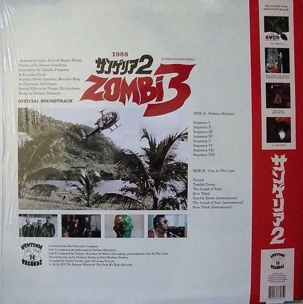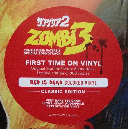 - Strictly Limited to 500 Unique Units, No repress, - This is The “Classic edition” in Colored RED vinyl 12″, housed in heavy cardboard old Stoughton tip-on jacket & VHS Obi. File under: Soundtrack, Haunting Synth, Decadent FM Rock & Erotic Funk. Tracklisting*: A1 - Seq 1 A2 - Seq 2 A3 - Seq 3 A4 - Seq 4 A5 - Seq 5 A6 - Seq 6 A7 - Seq 7 A8 - Seq 8 B1 - Nature B2 - Tumble Down B3 - The Sound Of Fear B4 - Slow Think B5 - Tumble Down (instrumental) B6 - The Sound Of Fear (instrumental) B7 - Slow Think (instrumental) ZOMBI 3 - THE SOUNDTRACK Classic Edition & Special Edition - Available Now on We Release Whatever The Fuck We Want ! WRWTFWW Records is delighted to unleash the complete uncut soundtrack for Lucio Fulci & Bruno Mattei’s cult zombie-ploitation gem Zombi 3 (aka Zombie Flesh Eaters 2 aka Sanguelia 2, 1988) available on 2 different collector’s edition vinyls for the first time ever. The Classic Edition comes in red is dead colored vinyl with a red Japanese Sanguelia 2 VHS obi and has a helicopter pictured on the back cover. The Special Edition has the same songs as the Classic Edition PLUS bonus skits/interludes with DJ Blue Heart talking (taken from the movie) on the b-side and comes in green inferno colored vinyl with a green Japanese Sanguelia 2 VHS obi and DJ Blue Heart pictured on the back cover. Both versions are housed in heavy old style Stoughton casebound tip-on jackets - pick your poison - get infected! This future deluxe edition OOP classic is packed with menacing synths, ghoulish melodies, and contaminated anthems remastered directly from the rare original reels of maestro Stefano Mainetti which were found at an abandoned top secret research facility.