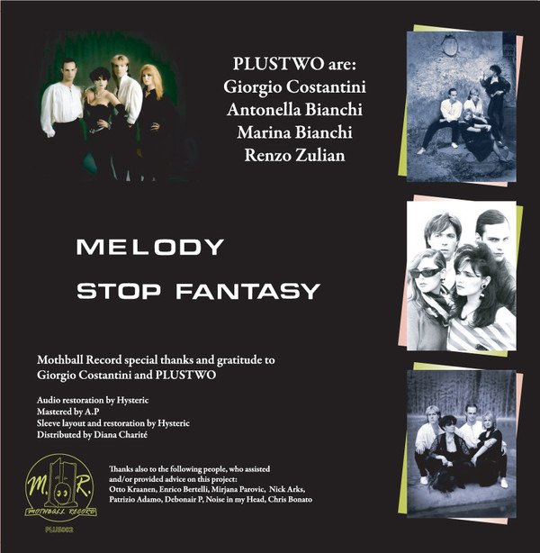 This highly anticipated reissue should need almost no introduction: Plustwo's 'Melody' / 'Stop Fantasy' 12" (and even 7" version) have long been sought after by both italo-disco and disco/boogie collectors and command high prices on both discogs and ebay. Both tracks represent some of the peak musical achievements of the vibrant Italian music scene during the early 80s; skilled performance from talented musicians, tastefully arranged with perfect and unmistakeable vocals from Belen Thomas. This reissue is the result of a dedicated effort by Hysteric and Mothball Record, in cooperation with the band, to make this record available to a wider audience.