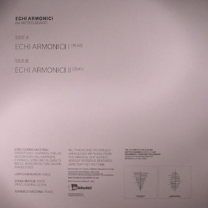 For fans of the Italian avant-garde, few names inspire the loyalty and devotion offered to the percussionist and composer Lino Capra Vaccina - a perfect emblem of the country’s extraordinary movement of musical Minimalism. He first gained note as a member of Aktuala, a project which laid the groundwork for a entire generation of practitioners following in their wake - creating a hybrid of rock, avant-garde, and ancient musics, while incorporating a diverse number of sonic traditions from across the globe - African, Middle Eastern, Indian, etc. Vaccina’s career as composer has been marked by two distinct features, an incredibly high bar of quality and ambition, and a tragically slim amount of recorded output. Following his departure from Aktuala, he worked extensively with others - Juri Camisasca, Franco Battiato, etc, and within the short lived super group Telaio Magnetico, but his astounding solo efforts have been slow to emerge. In 1978 he released the legendary LP Antico Adagio, and wouldn’t be heard from again until 1992’s equally extraordinary L'Attesa. Fortunately, over the last few years, the Milan based imprint Die Schachtel, has embarked on a multifaceted project - reissuing Vaccina’s hard to find LPs for a new generation, as well as offering a range of stunning archival recording which had never before seen the light of day. Their latest release, an LP entitled Echi Armonici da Antico Adagio, falls into the later category. It is nothing short of a momentous event.