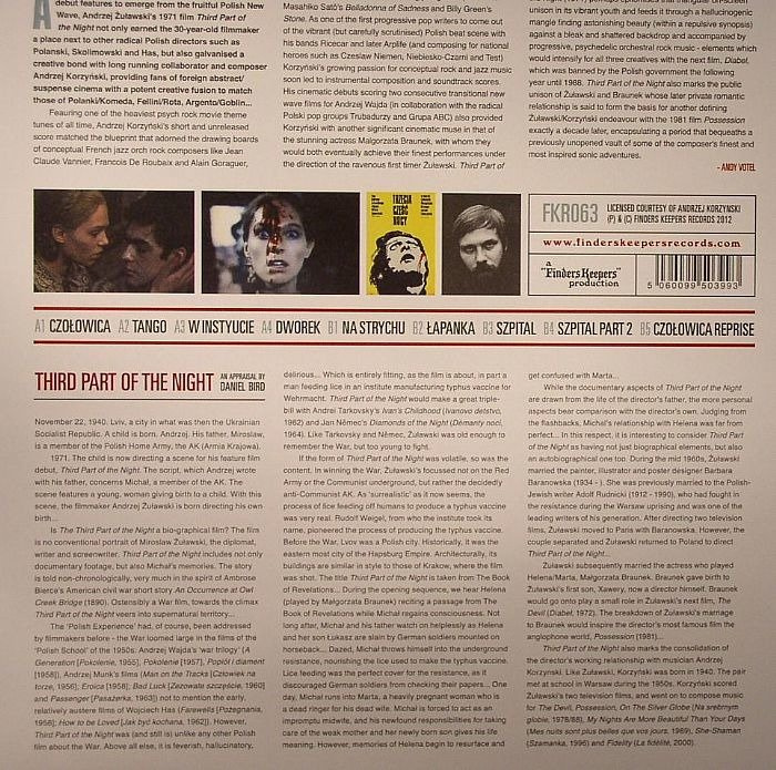 One of the heaviest psych rock film soundtracks of all time is made available again through Finders Keepers ! Andrzej Korzynski's short and unreleased score matched the blueprint that adorned the drawing boards of conceptual French jazz orch rock composers like Jean-Claude Vannier, Francois De Roubaix and Alain Gourageur, creating a soundtrack that unknowingly begs comparison to Masahiko Sat�'s Belladonna Of Sadness and Billy Green's Stone. As one of the first progressive pop writers to come out of the vibrant Polish beat scene with his bands Ricecar and later Arplife Korzynski`s growing passion for conceptual rock and jazz music soon lead to instrumental composition and soundtrack scores. His cinematic debuts scoring two consecutive transitional new wave films for Andrzej Wajda also provided Korzynski with another significant cinematic muse in that of the stunning actress Malgorzata Braunek with whom they would both eventually achieve their finest performances under the direction of the ravenous first timer Zulawski. Third Part Of The Night (1971) perhaps epitomises that triangular on-screen unison in its vibrant youth and feeds it through a hallucinogenic mangle finding astonishing beauty against a bleak and shattered backdrop and accompanied by progressive, psychedelic orchestral rock music - elements which would intensify for all three creatives with the next film, Diabel, which was banned by the Polish government the following year until 1988.