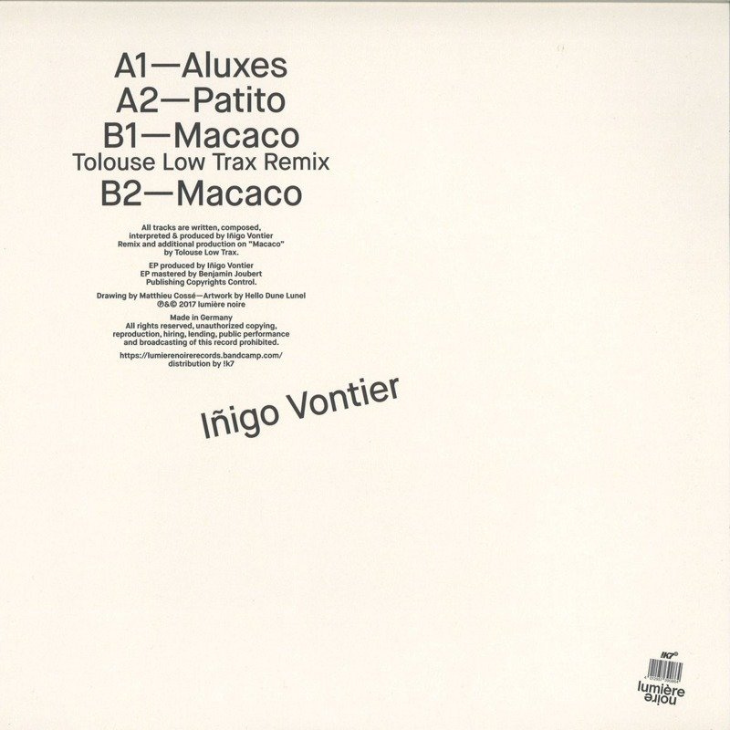 Related Artists Thomass Jackson, Red Axes, Tolouse Low Trax, Mijo, Rebolledo Info: Mexican producer Iñigo Vontier releases his 5th EP, including a massive remix from Tolouse Low Trax (Salon Des Amateurs, Antinote). This new Lumière Noire release will be accompanied by a tour of Iñigo Vontier in Europe. 'Since I was little, I've been immersed in the culture of the Mexican Aztecs and Mayas. So, logically, I'm attracted to magic and spells. Mixing both in my music is the perfect combination of my tastes and my roots". Seen from Europe, Iñigo Vontier's assertion can seem puzzling, but from the point of view of a Guadalajaran DJ-producer, this blending of genres makes all sorts of sense, expressing the dreams of peoples steeped in mystique, whose rites have provided refuge and hope through generations. As soon as the needle hits Aluxes ("it's the name of forest spirits, and it's pronounced 'aloo-chess',' according to Iñigo) a channel to occult forces does seem to open up. The EP's title track, with its sparse, unfathomable voices and its bouncing, metered rhythm, is like a spell operating its serene power over the listener. The spirits are at time tricksters: the facetious Patito and its stubborn metallic rhythm brings back Vontier's precious dark disco essence, which mellows out what would be more overly-serious Western electronic music: 'I'm proud to help the Mexican Dance Music scene make its international mark, along with Rebolledo and others. My personal contribution, along with my role as a label head, is to bring this sound to the world. Musically speaking, that means that our productions are increasingly influenced by Latino - and sometimes Arabic - sounds, which makes them more diverse and eclectic".
