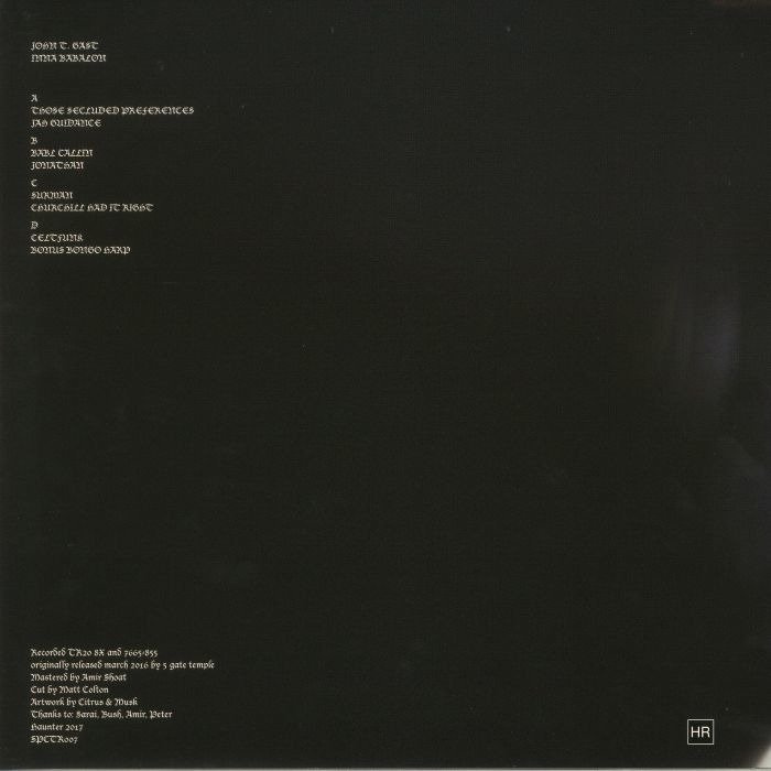 John T. Gast’s 'Inna Babalon' was originally published as a cassette on Gast’s 5 Gate Temple in 2016. An important offering in the British producer’s output. Haunter Records is now remedying the physical unavailability of the album by giving it renewed life as a Limited double LP. FIRST 300 COPIES ON CLEAR VINYL.