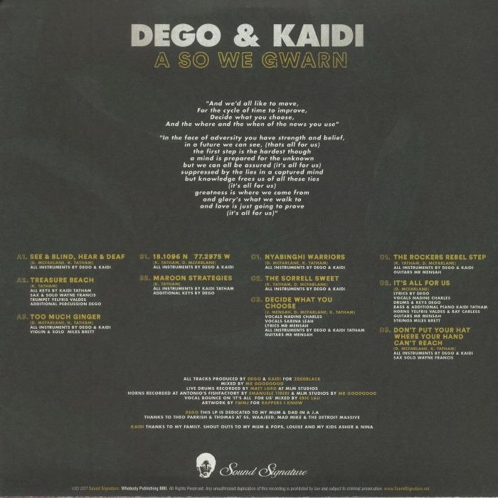 Here's something to set the pulse racing: a collaborative debut album (on Sound Signature, no less) from London broken beat veterans Dego and Kaidi Tatham. As with their previous joint releases on 2000 Black, Rush Hour, Eglo and, of course, Sound Signature, it's the duo's love of rich, jazz-fuelled musicality, sun-kissed melodies and loose, languid rhythms that shines through. There are naturally nods towards disco, boogie, jazz-funk, Afrobeat, hip-hop and classic "bruk", with a stellar cast list of guest musicians and vocalists swinging by to lend a hand. If Herbie Hancock decamped to Ladbroke Grove and made an album with Bugz In The Attic, it would probably sound like this. In our book, that's a very good thing indeed.