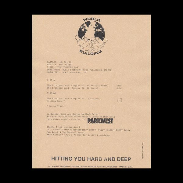 A year after he helped launch the label via the brilliant "The Fatal Flaw In Disco" 12", Mark Seven returns to Ari Goldman's World Building label. As you might expect, he's once again in a retro-futurist frame of mind, laying down a series of house tracks inspired by the style's glory days of the late '80s and early '90s. He first doffs a cap towards bouncy New Jersey deep house from the turn of the '90s ("Chapter II: Enter This House"), before wrapping Chicago style analogue bass and fluid electronics around a sweaty, Kenny Dope inspired rhythm track. "Chapter VII: Salvation" is a smooth and loved-up tribute to the Burrell Brothers and Dream II Science, while closer "Helping Hand" is pleasingly deep and dreamy.