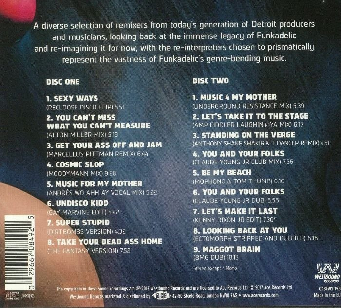 Funkadelic were the most influential group to emerge from Detroit in the 1970s. Their early albums have cast a long shadow over everything that came afterwards in the city. It was music that understood the past but was firmly aiming towards the future and mixed soul, funk and rock into an almost unimaginable stew. Albums such as “Maggot Brain", “Free Your Mind And Your Ass Will Follow” and “Cosmic Slop” are regularly featured in all-time greatest lists. From the techno pioneered by the likes of Carl Craig and Underground Resistance, to the garage rock revival spearheaded by the White Stripes and the Dirtbombs, all have paid homage to the Parliafunkadelicment Thang. This album is a tribute from some of the most important recording artists currently working in the city to these most influential of forefathers. The very finest talent now active in Detroit appear on the record, being given free rein to work on the multi-track tapes, to rework in any way they see fit. We have full-on remixes, futuristic creations using the original track as an inspiration, disco-fied re-edits and skeletal dubs. Spearheaded by Brendan Gillen of Interdimensional Transmissions, the set features names working across the musical spectrum. There is an appearance by those most mysterious of techno pioneers Underground Resistance, and by Kenny Dixon Jr and his alter-ego Moodymann. The Dirtbombs throw down a frenetic take on ‘Super Stupid’, whilst disco re-edit expert Gaye Marvine adds his magic to ‘Undisco Kidd’. Other contributors include Funkadelic alumni Amp Fiddler, Marcellus Pittman and Anthony Shake Shakir. This is a worthy celebration by New Detroit of its most twisted and illustrious forebears. Available as a limited edition triple vinyl LP and as a 2CD digipak.