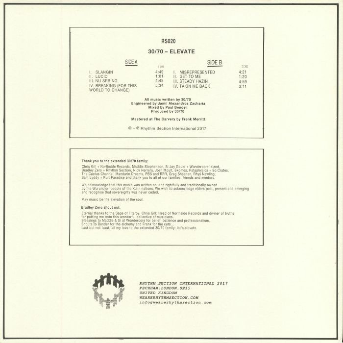 We've long felt that there's something in the water down in Melbourne. Australia's second city is home to a surprisingly high number of talented producers, musicians and DJs. The latest outfit primed for international success is 30/70, a nine-piece collective that's has been doing its thing since the middle of the decade. Elevate, their first 12" for Rhythm Section International, offers an expansive showcase for their genre-bending, fusion-heavy style, where bustling jazz instrumentation and seriously soulful vocals are effortlessly blended with elements of Afrobeat, jazz-funk, broken beat, hip-hop and hazy downtempo grooves. It's a deliciously warm and summery set of tracks, all told, suggesting that 30/70 will be a force to be reckoned with for years to come.