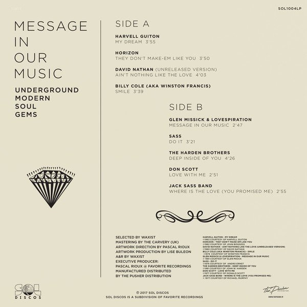 After a first year of activity with 3 beautiful single reissues, Sol Discos presents its first album, with the compilation Message In Our Music, selected by Waxist. Focusing on Modern-Soul genre, the selection ranges from 1976 to 1983 and gathers a nice selection of independent and private press records, all officially licensed. . From the David Nathan's downtempo previously unreleased version of "Ain't Nothing Like The Love", to the beautiful Glen Missick's gospel dancer "Message In Our Music", the album aims at providing to the listener a glimpse of the wide spectrum of productions that exist in this musical genre. Some of these beauties are officially reissued on vinyl for the very first time, including some highly sought after records such as "Deep Inside Of You" by The Harden Brothers, "My Dream" by Harvell Guiton, or "Love With Me" by Don Scott. The album has been fully remastered by The Carvery in the UK, and features liner notes for each of the songs, plus exclusive pictures provided by the involved artists & producers.