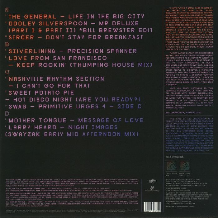 "Everything I do now started with record collecting. It's the foundation of my career; from writing about music, DJing in clubs, putting compilations together or spending many late-night hours, glass of red wine in hand, bidding on stupid records on eBay." - Bill Brewster Spanning 41 tracks, 'Tribal Rites' is a musical autobiography of sorts from one of dance music's most dedicated historians, Bill Brewster. Released this November on 3 CDs and double vinyl via Belgium's Eskimo Recordings, the compilation takes us on a personal journey through Bill's 36 year long involvement in the music industry. Whether running DMC's New York offices or labels including Twisted UK and Forensic, being one of Fabric's original residents, writing (with Frank Broughton) probably the definitive overview of DJ culture, the seminal 'Last Night A DJ Saved My Life' and the equally essential 'How To DJ (Properly)', running the DJhistory website or promoting their much loved Low Life parties, Bill's fingerprints can be found all over dance music's past few decades. So whilst there are few people more qualified to compile such a thing, 'Tribal Rites' isn't just a 'House & Disco Greatest Hits', instead we have the soundtrack to a life spent at the coalface of record collecting, of early mornings at car boot sales and late nights logged onto Discogs. Split into three sections, the compilation begins in the post-punk period, and through tracks such as explores the influence of dub on bands of the time such as Orang Utan, General Strike and The Raincoats. The second section takes us into that mish-mash of sounds and styles best described as 'Balearic' where the likes of Bobby Gentry and Final Edition can happily co-exist and a country and western cover of Hall & Oates 'I Can't Go For That' seems like the most obvious thing in the world. The final section then concentrates exclusively on house music, though again showcasing just what a broad church House is, able to accommodate both the spiritual yearnings of Mother Tongue's 'Message of Love' and the precision tooled productions of Basic Channel's Maurizio. At a moment in time when dance music is more prominent than ever and DJs are treated like pop stars, 'Tribal Rites' is a vital reminder that there's a lot more to DJing than just downloading the latest Beatport chart and waving your hands in the air.