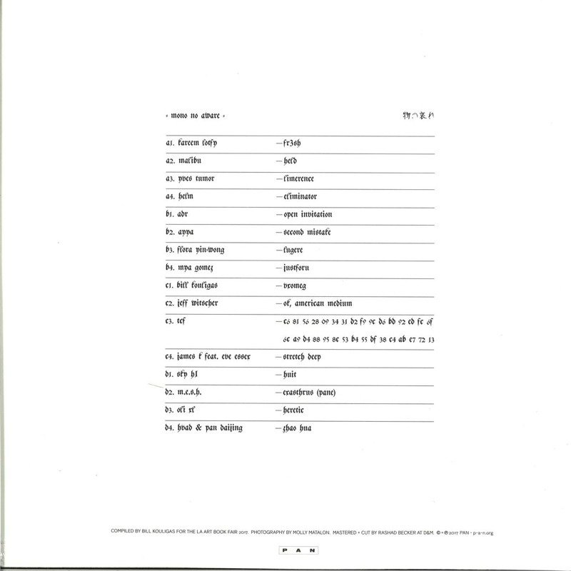 Mono No Aware is the first compilation to be released on PAN, collating unreleased ambient tracks from both new and existing PAN artists. Featuring Jeff Witscher, Helm, TCF, Yves Tumor, M.E.S.H., Pan Daijing, HVAD, Kareem Lotfy, ADR, Mya Gomez, Sky H1, James K, Oli XL, Bill Kouligas, Flora Yin-Wong, Malibu, and AYYA, the compilation moves through more traditional notions of what is called 'ambient', to incorporating wider variations that fall under the term. 'Mono No Aware', 'the pathos of things', also translates as 'an empathy toward things', or 'a sensitivity to ephemera'. A term for the awareness of impermanence, or the transience of things. A meditation on mortality and life's transience, ephemerality heightens the appreciation of beauty and sensitivity to their passing. In investigating the passing of time, the boundaries between memory and hallucination become blurred; between fiction and reality. The movement of time transforms into an eternal present..