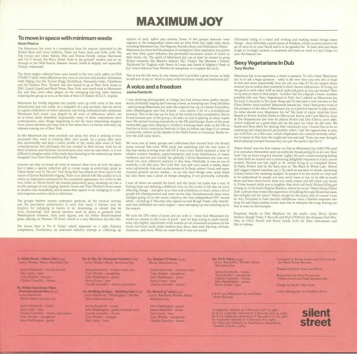 Maximum Joy is an aspiration, a claim to passion. To call a band 'Maximum Joy' is to ask a huge question - what is the very best you ever felt or hope to feel and more importantly how far can you take it' Silent Street is a new collaborative label from Chris Farrell (Idle Hands) and Kiran Sande (Blackest Ever Black). For their first release they're proud to present I Can't Stand It Here On Quiet Nights, a compilation of singles by one of our shared musical lodestars, Bristol's extraordinary Maximum Joy. The band was formed in 1980, by 18 year-old photography student and vocalist Janine Rainforth alongside Tony Wrafter, a trumpeter/saxophonist previously affiliated with Glaxo Babies. Wrafter's former accomplices, Charlie Llewellin (drums) and Dan Catsis (bass), completed the original line-up, alongside erstwhile Pop Group guitarist John Waddington. With a youthful confidence and energy that leaps out at you even now, they took their diverse influences - punk, modern jazz, disco, dub, funk, soul, early hip-hop, Afrobeat and chansons - and distilled them into some of the greatest, most intoxicating pop music ever made. Together they carved out a story which today stands as a sumptuous feast for anyone interested in the roots and evolution of "the Bristol sound". Along with prior associations with The Pop Group and Glaxo Babies, there are links, back and forth, with The Slits and Dennis Bovell, Adrian Sherwood and On-U Sound, the Berry Street hole in the ground' studios, and so on, through to the Wild Bunch, Massive Attack, Smith & Mighty, and Tricky's 'Aftermath'. Thirty-five years on its impossible not to be blown away by their combination of instrumental virtuosity and DIY pluck, and by their fearless application of disorientating dub FX. In terms of open-minded, progressive and life-affirming music made in the post-punk era, little else comes close. I Can't Stand It Here On Quiet Nights - the first ever official UK reissue of Max Joy material - is centred around the trio of singles the band released on Y Records between 1981-1982. Their first, 'Stretch', was licensed to seminal American label 99 Records and soon after became an anthem on the New York club underground, a cult staple at Danceteria and on late-night radio. This comp gives pride of place to their first B-side, 'Silent Street / Silent Dub': a languid, haunting tribute to long summer nights in St Pauls (where the Idle Hands shop presently resides) and specifically the Black & White Cafe, where dub-reggae reigned supreme, 24/7'. Llewellin's mesmerising one-drop kit and Catsis's outrageously heavy bassline anchor the track, allowing Rainforth's exquisite vocal and Wrafter's trumpet to soar within the intense, expressionistic dub mix. In both subject matter and execution it is the definitive Bristol tune. 'White And Green Place (Extraterrestrial Mix)', 'In The Air', and wistful instrumental 'Simmer Til Done' also feature, the non-Y bonus is the 12' version of 'Do It Today', Maximum Joy's contribution to the Fontana compilation Touchdown, which originally came out in '82 as a white label split with The Higsons. I Can't Stand It Here On Quiet Nights will be released on 2x12' vinyl, with sleevenotes by Janine Rainforth, Tony Wrafter and Kevin Pearce. Time to acquaint, or reacquaint, yourself with the eclectic, exhilarating work of Bristol's finest, brightest pop idealists.