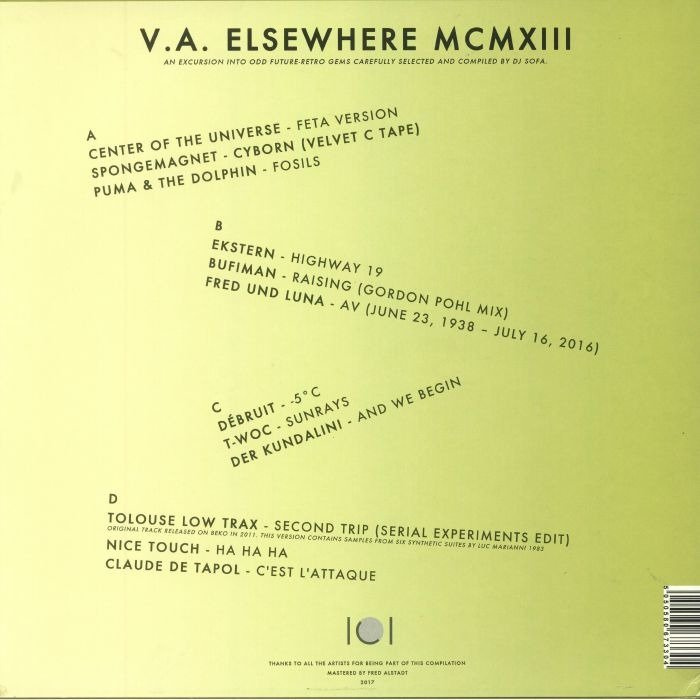'ELSEWHERE MCMXIII' is a compilation full of electronic textures with a unique character to it, analog, lo-fi, slow dancing vibes. Compiled by DJ soFa for Débruit's ICI label, the record is a 12-track journey through future retro oddities, that navigate in disco, coldwave, kraut territories, with a taste for experimentation, while being great to dance to. It showcases a scene well represented at clubs like "Salon des Amateurs" or close to labels like Antidote, Music From Memory, Macadam Mambo and Dark Entries. 12-track double vinyl. Digital version also available.