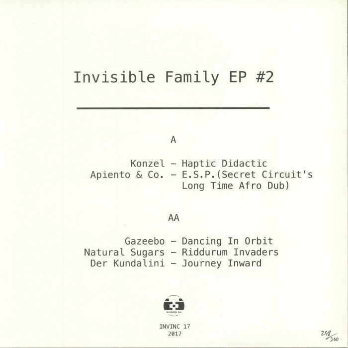 Finally the long-awaited second series of ‘Invisible Family’ outings has arrived. Label boss and compiler GK Machine has this to say: ‘Beyond ecstatic to get these tracks out. The Gazeebo track I’ve been playing in my sets for years. Digital only but SO great it definitely needed to get pressed onto wax!! I would DJ with it using Ableton and speed it up a lot so for the vinyl I asked Jon (Nedza) who I’ve been a huge fan of since his Community Recordings releases on Grayhound and Imperial Dub, whether he could speed it up a little bit before we pressed it up. Now it’s 100% perfect: a Moroder-esque cosmic stomper that’s sure to set any dancefloor alight. The Apiento track is another one that’s been gestating for a long time…first appearing around the time the original “E.S.P.” 12′ appeared on the wonderful Golf Channel Recordings in 2014. Secret Circuit gave it a complete overhaul, in fact several complete overhauls, plus some of his signature guitar and has turned the already blissful track into an afro-esque, trippy, beautiful, beautiful piece of music that (IMO) is one of his best yet. Utterly gorgeous!! Then there’s the boy-girl retro-future duo Der Kundalini coming from the wonderful Lectric Sands stable in NY who gave us Zoovox. This one’s also been hiding on my hard drive way too long! Finally relative newcomers Konzel (of Junto Club/Optimo Music fame) & Natural Sugars (Pardon My French) round off the package just perfectly. The former so distinct that I felt it was a perfect opener for the A side. So, I hope you dig it…and keep an eye out for the super limited 12-track cassette too!!!’ Limited to 300 hand-numbered copies.
