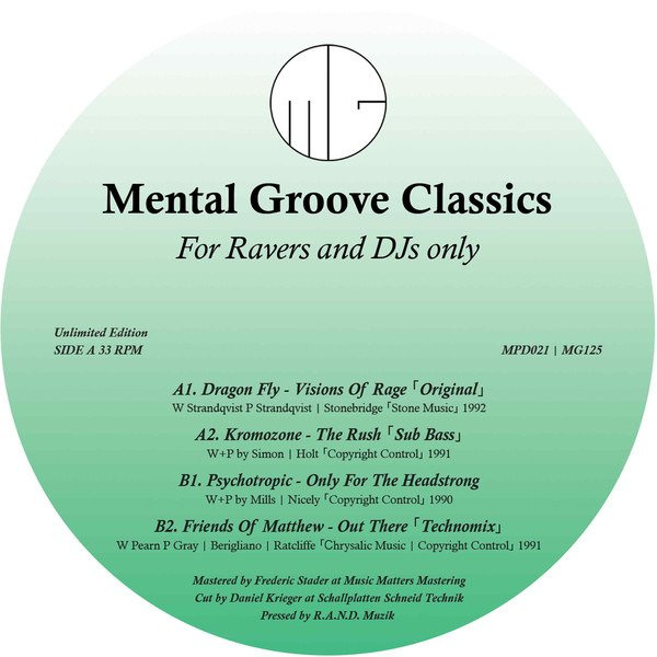 HQ 12″ EP plus 2 sided 30x30cm liner notes written by Jerome Hill - 4 sought after tracks, plus extra loops and intros for DJs! - For fans of Early Raves and Hardcore Manic House Music circa 1990-1992 Tracklisting 12″ /EP: A 01. Dragon Fly (loop) 02. Dragon Fly - Visions Of Rage (Original Mix) 03. Kromozone (loop #1) 04. Kromozone (loop #2) 05. Kromozone - The Rish ( Sub Bass Mix) 06. Kromozone - Chillin’ FM (radio clip) B 01. Psychotropic (intro) 02. Psychotropic (loop) 03. Psychotropic - Only For The Headstrong 04. Friends Of Matthew (intro) 05. Friends Of Matthew (loop) 06. Friends Of Matthew - Is There Anybody Out There 07. Friends Of Matthew - Chillin’ FM (radio clip) Info Mental Groove Music and Musique Pour La Danse are ecstatic (and there couldn’t be any better way to express our feelings here) to announce the first volume of Mental Groove Classics, music played at the early warehouse raves and illegal fields parties of the same name. A compilation of rare, forgotten or sought after gems, topped with extra loops and intros for the working DJs, and each side of the record ends in style with original pirate radio cuts which showcase the music in its original context, extended liner notes and interviews of the featured artists by DJ, producer and radio host Jerome Hill of Don’t / Super Rhythm Trax / Kool FM London fame. All tracks are remastered from the original sources by former Dubplates & Mastering engineer Frederic Stader (aka Dj Maxximus / Warp Records) and cut by Daniel Krieger at the legendary Schallplatten Schneid Technik studios ...