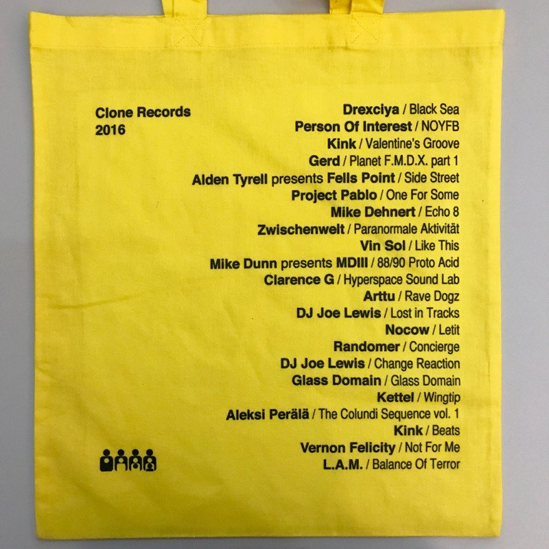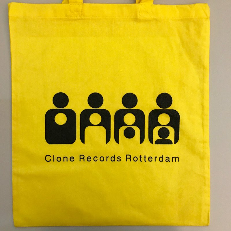 Black cotton bag with white Clone logo. Holds 15 records with ease and about 20 with a bit of effort.