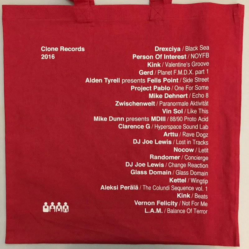 Black cotton bag with white Clone logo. Holds 15 records with ease and about 20 with a bit of effort.