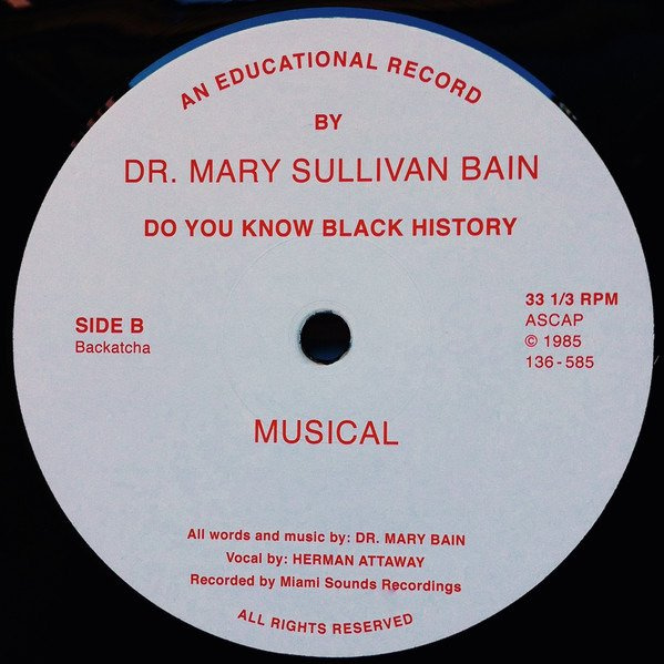 A teacher by trade, Dr Mary Sullivan Bain recorded her musical works to be used as an educational and motivational tool in the Miami-Dade public school system she taught in. The single was Recorded at Miami Sound Recordings, South Florida and released in small numbers as a self-published 12” pressing for educational purposes. Copies of ‘Do You Know Black History’ did not circulate much further than Florida’s public school libraries and the vaults of some local radio stations when it was released in 1985. Produced with no label constraints, Mary worked alongside her friend and vocalist Herman Attaway. She would give him the words and the melody and together they translated her ideas into song. If one wanted to categorise it they’d have to put a copy in a few different boxes … 808’s, bass synths, deep chords, live percussion and effects dubbed into the mix. The production leans towards the electronic diy framework that informed the local sound on the south side. Whilst the categories are blurred what’s clear is that the musicians who made this thought outside of the box.