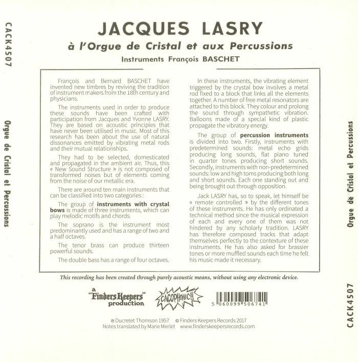 This EP and its varied three-pronged assault is the first step in the legacy of the Lasry Baschet unison uniting the husband and wife team of Jacques and Yvonne Lasry plus their son Teddy (who would later create Magma with Christian Vander) and hard material sculptors François and Bernard Baschet (who would later work with William Klein). It was this creative unison between visual art and experimental music, witnessing the Lasry family exchange their orthodox music skills in favour of crystal rods, balloons, wet bows and metal sheets, that would potentially change the course of European music which was already on the extreme verge of electrocution with the rise of tape music and embryonic synthesised instrumentation.