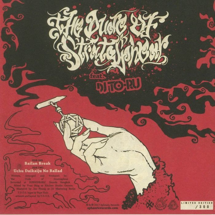 The Single > Side A 'BAILAN BREAK' is T.D.O.S. third single featuring Japanese turntablalist DJ TO-RU (Dujada-Goja) is Side B is 'UCHU DAIKAIJU NO BALLAD' (The Ballad Of The Space Monster) featured samples of Gozilla dialogues with a scary soundtrack mood.on a progressive and experimental beat. The Artist > The Dude Of Stratosphear aka T.D.O.S. is Jerome Doudet (Swiss/French artist and bass player based in Bangkok). DJ, vinyl collector, musician, graphic designer and East Asian music connoisseur, The Dude of Stratosphear was groomed in the vibrant alternative scene of the very international city of Geneva Switzerland. Growing up in a musical household (His father was a disco DJ), Growing up in a musical household (His father was a disco DJ), Jerome was exposed to a wide range of music at very early age, and started playing the 4 strings at the age of 10. Bass player in the swiss math-core bands Knut for a decade, he toured intensely all around Europe's biggest venues and festivals. He also joined the very underground american band Half Japanese for a couple of european tour and recorded the album Bone Head in 1997. And on top of the list was opening for the mighty KISS with the canadian band Bionic (CA) at Molson center in Monteal. Also member of various bands such as Imericani (SP/IT/CH), Intercostal (CH), Troll Patrol (CH), Bliscappen Van Maria (CH-IT), Edison (CH), Polar (CH-FR), Prejudice (CH-FR), Buz (CH), Void (CH), Ultra DB (CH), to name a few. Aside from the rock scene, he was also part of the multimedia team Ultra Pepita , developer of the today's world famous VJ software Modul8.