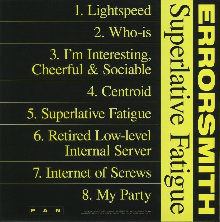 Returning with his first album in 13 years, Errorsmith's 'Superlative Fatigue' long-awaited release on PAN arrives as his perhaps most optimistic record yet. Placing a strong emphasis on spectral exploration, the tracks tell an inherent story and span a musical arc with his recognisable synthesised tones, computerised vocal effects and timbral changes in motion. In comparison to his previous productions, Errorsmith (Erik Wiegand) sees the release as less abstract, harsh or aggressive: 'I would say it is rather accessible and cheerful; at times ridiculously cheerful but still very sincere and emotional.' He suggests. 'I find it touching when this little android raises its pitch at the end of 'Lightspeed' or the android catching its breath in 'My Party' for instance.' The album title, 'Superlative Fatigue' reflects this tension between an over-the-top, hysterical emotion, against more deeply felt expressions or realness. Besides collaborating with the likes of Mark Fell, to Berghain resident Fiedel as MMM, and Soundstream as Smith N Hack, Wiegand has released a string of seminal dancefloor tracks. Building his own instruments using modular software synthesizers is a large part of his work. Where almost all the sounds in the LP were created with his synth, 'Razor', (a synthesizer plug-in he developed for Native instruments, released in 2011) or slightly modified versions of it. Premiered at Unsound Festival last year, this new material he has developed since has finally taken form in this epic full-length. The album is mastered by Rashad Becker, featuring artwork by James Hoff and layout by Bill Kouligas.