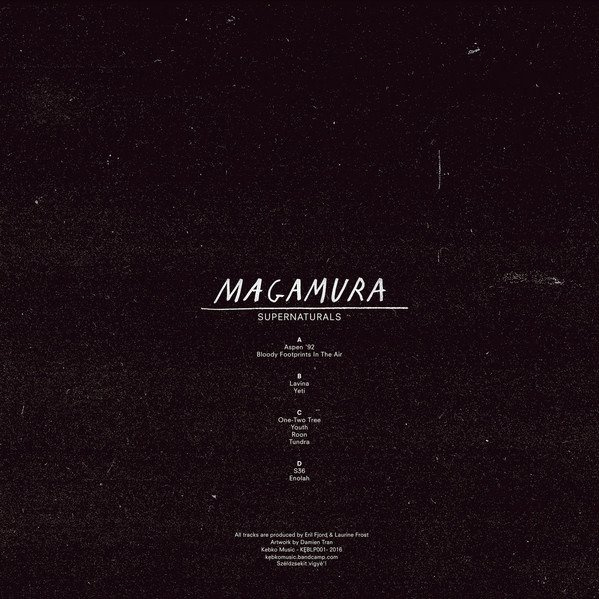 * Following their surprising debut on cassette tape in past February, Magamura put out the vinyl version of Supernaturals. Comprised of Eril Fjord and Laurine Frost, the Hungarian duo have carved out their reputation through live performances at renowned festivals and venues like Arma in Moscow, combining the formar's indie aestheric and the electronic music prowess the latter has proved on work for the Nervmusic imprint. Despite their huge influence from the 70-80s experimental music, Supernaturals is not so much retrospective as ominously dystopian. It captures and distils their well-known improvisational mutability into a testament to their promising potential, which will stand the test of time. This is Kebko Music's first instalment on vinyl. Following our tradition of carefully-wrought artwork, the LP comes in a gatefold sleeve designed by Damien Tran.