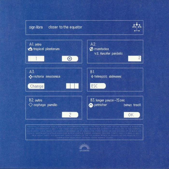 Released under the moniker Sign Libra, Closer to the Equator is the work of Latvian artist and composer Agata Melnikova. Composed for a contemporary ballet at Latvian National Opera in Riga, the music on this record strongly relies on Melnikova's appreciation of BBC-produced nature documentaries. Projecting the life of each creature that inhabits the British TV-program into her very personal and highly synthetized world, Sign Libra lends these microscopic beings her own voice. Each song works like a musical tableau' in which the main protagonists - plants and animals - come on stage to play their part in a ballet carefully choreographed by the Latvian artist.
