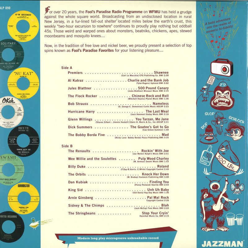 For over 20 years, your irrepressible host Rex and his legendary Fool's Paradise radio show on WFMU has held a grudge against the whole square world. Broadcasting from an undisclosed location in rural New Jersey in a fur-lined fall-out shelter located miles below the earth's crust, this weekly "excursion to nowhere" continues to proudly play nothing but greasy grooves from inane 45s, non-hit misfires, curveballs and oddballs from the Rock & Roll era. Yes sirree, those weird and warped ones about monsters, beatniks, chickens, apes, stewed moonbeams and mosquito knees...