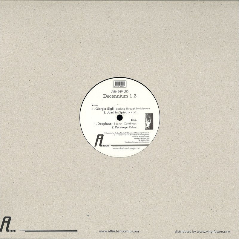 Decennium 1.3 is the final part of a 12 series celebrating Affin's 10th anniversary. Find 4 hypnotic techno tracks from Giorgio Gigli, Joachim Spieth, Deepbass and Periskop.