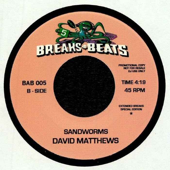 The Beats and Breaks series of "Extended Break Edits" has so far succeeded in its stated aim to provide DJs with simple but devastatingly effective rearrangements built around lengthening key percussive packages. The mystery editors behind the series are at it again here, first looping up the distinctive, cowbell and triangle-driven drum passages dotted throughout Bob James' classic "Take Me To The Mardi Gras". On the flip, they take their scalpel to David Matthews' 1977 jazz-funk gem "Sandworms", casually making merry with the proto hip-hop beat, rubbery bass guitar, flanged guitar riffs and snaking saxophone solos.