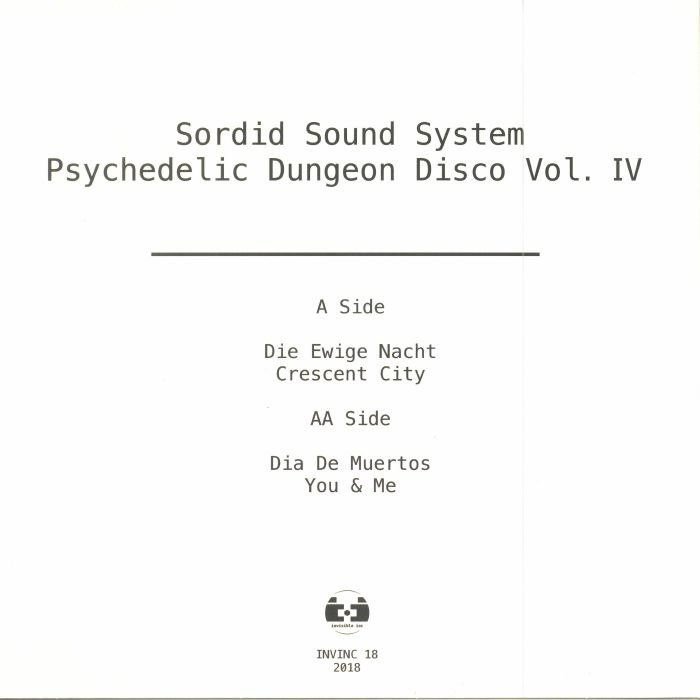 Having recently relocated to the remote redwood forests of Northern California in order to set up a satellite mixing studio for his old stomping ground, Glasgow’s Green Door Studio, Sordid Sound System returns to Invisible Inc with 4 cuts of Psychedelic Dungeon Disco. The EP opens with his most blissed out track to date ‘Die Ewige Nacht’, an eight and a half minute inverted sun ritual based around shimmering cascades of dubbed up electronic percussion and an overdriven tintinnabulated FM arp. Hi-NRG meets 80s B-Boy electro on ‘Crescent City’ with a careering off-road excursion into tripped out mutant carnival cavalcade territory. Dia De Muertos’s offbeat eerie percussion and driving low frequencies are met with spectral buzzing melodic refrains from the furthermost reaches of a decaying Oaxacan cemetery. The acid drenched ambient lullaby ‘You & Me’ brings proceedings to a fittingly fucked up close. Sordid Sound System’s last release on Invisible Inc, 2017’s ‘Fear Eats The Soul’, received plays and praise from the likes of Manfredas, Trevor Jackson, Sascha Funke, Optimo’s JD Twitch and Thomas Von Party.