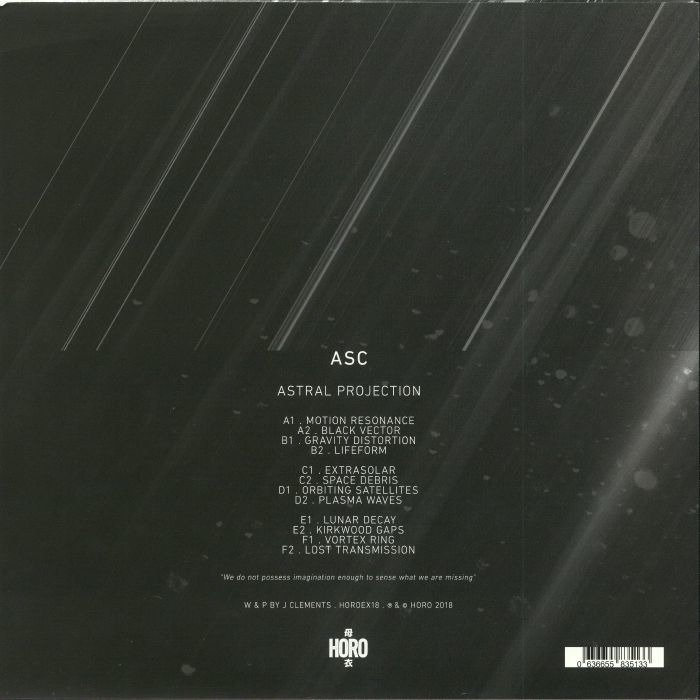 One of the most important artists in the development of the Horo sound, Astral Projection is the first full length ASC album for the Horo label. Astral Projection follows on clearly from 'Imagine The Future' with the development of the Grey Area sound progressing and becoming intrinsic to a large majority of ASC's current work. But this LP is not a Grey Area addendum, Astral Projection is a luminous artistic statement from a sonic perfectionist who the term 'sound designer' was made to define. An accomplished and much respected ambient producer, ASC weaves his talent for soaring emotive soundscapes with his undeniable rhythmic prowess across a cohesive 12 track sonic voyage that again accomplishes a rare goal in todays electronic music landscape - a commanding listen from beginning to end. Very few artists are as prolific and consistent as ASC, but we are confident Astral Projection will be revered as one of his finest moments in years to come.