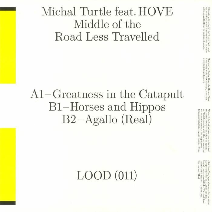 The music on 'Middle of the Road Less Travelled' is a continuation of Michal's musical exploration into other-worldly territory. Michal is a master in building hypnotic textures from repetitive rhythms that collide with trippy and atmospheric synthesizers. The delayed and dubby guitar lines by HOVE were recorded during rehearsal sessions in Michal's living room in Basel and the last track of the EP 'Agallo (Real)' ends with vocals performed by Lucianne Lassalle. Besides playing in local bands with Michal back in the 80s, Lucianne also performed and co- wrote early Michal Turtle tracks like 'Phantoms of Dreamland' or 'Village Voice' from his first record 'Music from the Living Room'.